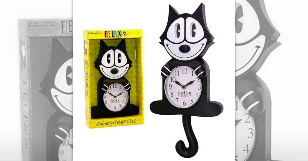 What time is it, Felix? Cute and clever clock features Felix the Cat, the cartoon character. He'll brighten your day whenever you check the time! Felix the cat knows what time it is. It's time for you to pick up this cute and clever clock that's created in his unmistakable image!