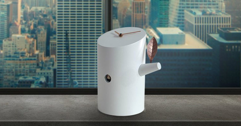 Nido table cuckoo clock by Progetti is an innovative cuckoo clock designed by Nazzareno Ruspolini. The designer was inspired by the very simplest of our flying friends' homes: a hole in a trunk. A cylinder cut as if by a woodsman, a small branch and a copper leaf create the elegant and refined image that the designer wanted to convey with this design object. Perfect for any bookshelf, shelving or surface in the modern or traditional home or office. The copper hands are installed on an angled surface to ensure the clock can be read from any position.