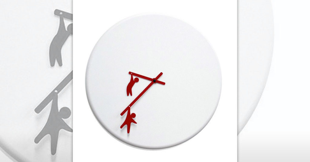 Time2play Wall Clock by Progetti. The clock shows the willingness to interpret in an ironic and playful the passage of time bringing a bit of joy at any time of day. The little men clinging to the hands show their performance as circus trapeze artists. Made of wood. Battery quartz movement.
