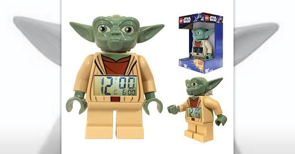 Push down on Yoda's head to light up his chest! 9-inch tall Yoda clock has an alarm function. Great gift for any Star Wars fan! The must-have bedroom accessory for any Star Wars fan, this LEGO Star Wars Yoda Minifigure Clock is an easy gift for anyone with a friend or family member who craves everything Star Wars. With movable arms, Yoda is interactive enough to be fun in his own right, and the digital display below his chest lights up in red when you push down on the 9-inch tall guy's head.