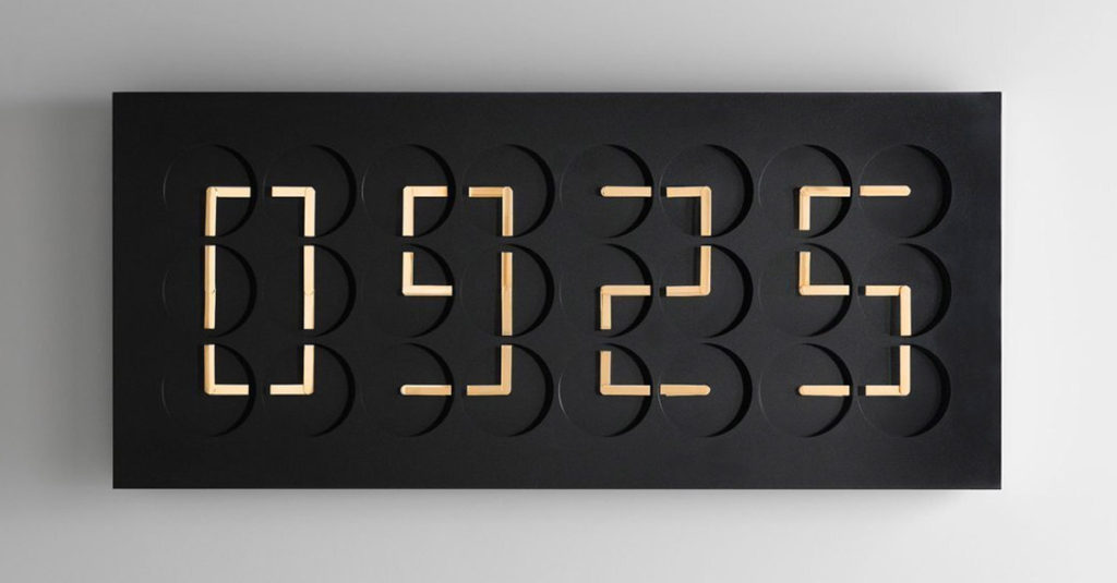 Twenty-four clocks come together to tell a collective story in one singular digital display. Each individual clock hand is choreographed in line with the others, so that these clocks tell the time as a collective, rather than individually. The piece can be programmed in 12- or 24-hour time and has three different modes of movement between each minute: minimal, medium or elaborate.