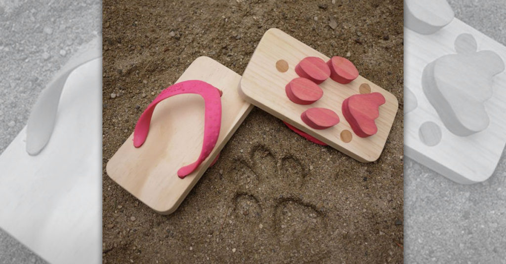 "Ashiato" means footprint and you will certainly be leaving some interesting prints in the sand with these clever and fun children's sandals. The colorful wooden designer footwear are perfect for the beach and come in five versions, each with their own color and creature "footprint". Choose from an orange monkey, a yellow owl, a pink cat, a blue gecko, or even a prehistoric turquoise tyrannosaurus. Each has its own distinct markings, from the paw of the cat to the unique splayed foot of the gecko. There are also four different sizes so kids of all ages will be able to enjoy making surprising footprints in the sand! "Look, Mom, I'm a dinosaur!" "Now I'm a monkey!"