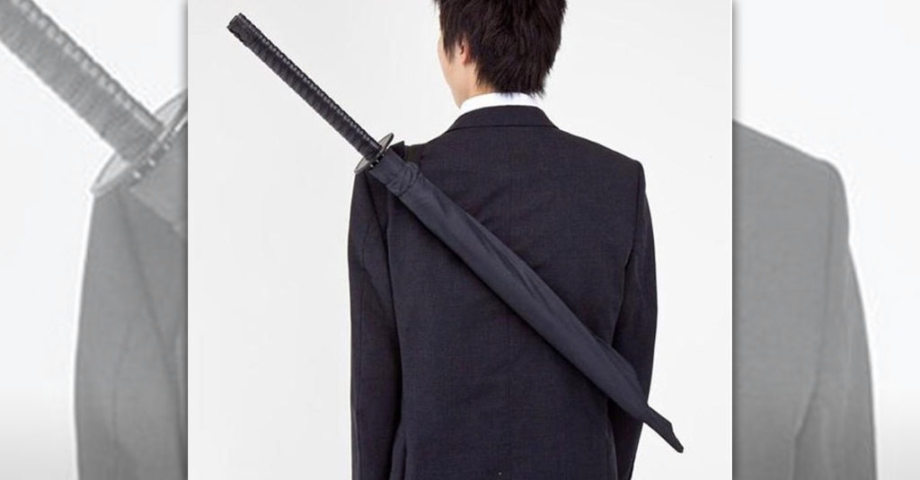 There's a lot to like about umbrellas - they keep you dry while letting you wear whatever you want, they don't get clammy like raincoats, and they're a great excuse to put your arm around a lady. That said, an umbrella is about the least manly accessory a guy can have...until now. The Samurai Umbrella replaces your boring umbrella grip with a Japanese sword handle, into a dashing, rainproof road warrior. We've even included a shoulder case for the umbrella, so you can carry it bandolier-style and free up your hands.