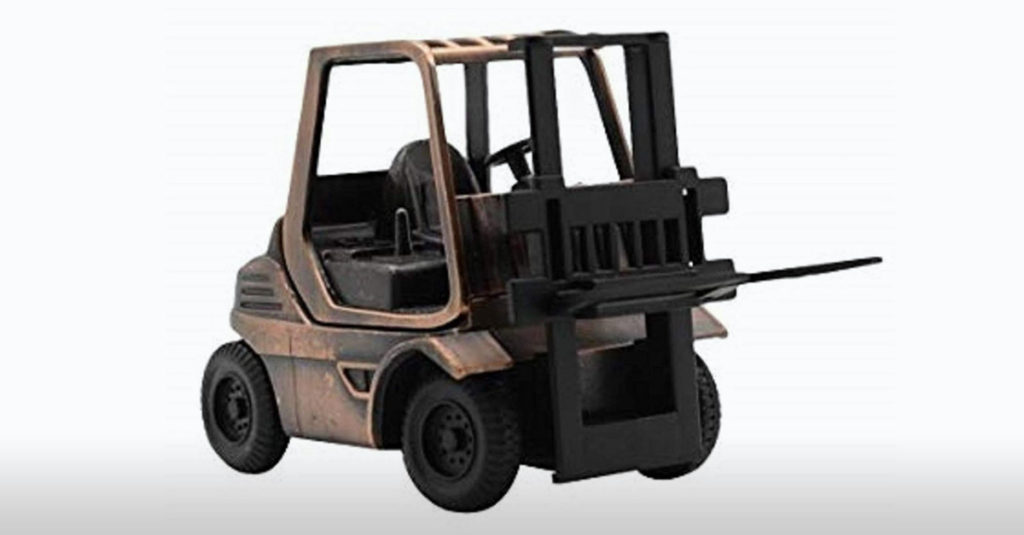 With great attention to detail, the miniature forklift features moving wheels, forks that lift and fold, and intricate finishes like a moving steering wheel and gear shift.