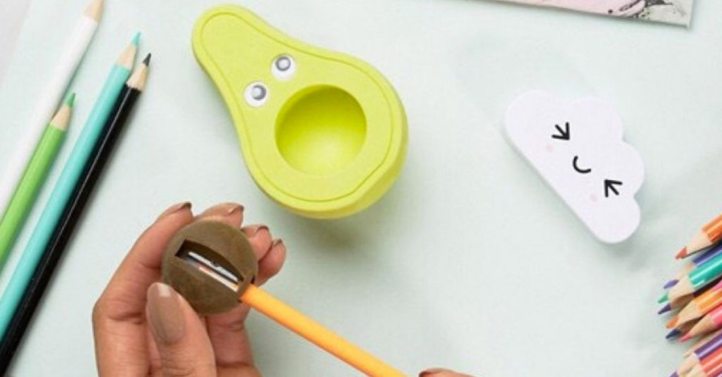 The Avocado stone pencil sharpener is held neatly in the googly-eyed Avocado skin.