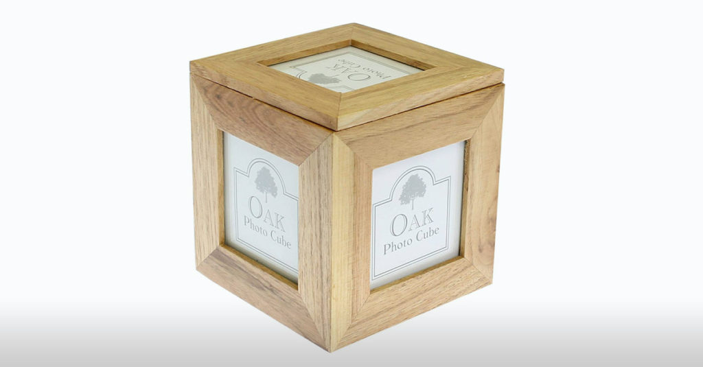 Holds 4 pictures around the outside of the cube & 1 photo on the top of lid.