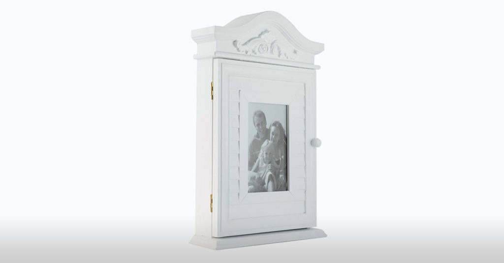 The vintage classic looking key cabinet is made of wood. The unique design in combination with a built-in picture frame (picture size 9x13 cm) makes the key cabinet a very special design item whether next to the cloakroom or kitchen (floor) e.g..