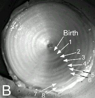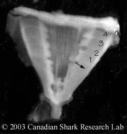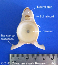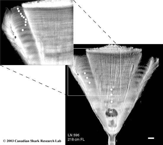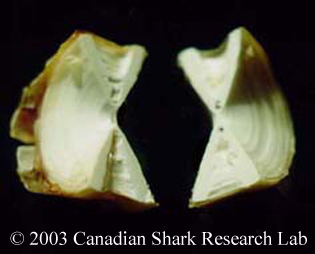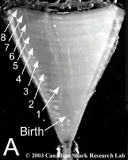The age of a shark is determined by counting the growth rings formed on the vertebra. The vertebral rings are laid down on a yearly basis not unlike those of trees. This method is analogous to the method used in ageing bony fish using the otolith (earstone), although not as well refined. However, sharks do not have otoliths, necessitating the use of the vertebrae. The web site of the Otolith Research Laboratory gives a more complete description of age determination practices in bony fish. The web site Skates and Rays of Atlantic Canada provides detailed information and methods on the age determination of skates and rays.