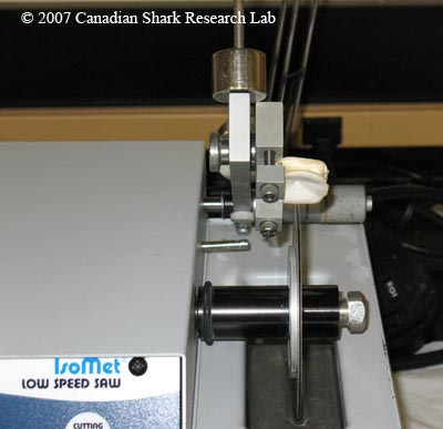 Vertebrae from the backbone of the shark are prepared for ageing by embedding and sectioning them. Several vertebrae from the cervical region are first removed from the animal and all the surrounding tissue (muscle, etc) cut away from the centra. The top of the haemal arch is removed to allow removal of the spinal cord. One or two of the calcified centra are then sectioned through the centre of the centrum with a low-speed diamond-bladed saw. The cut is made perpendicular to both the centrum face and the haemal arch. For shark species with large vertebrae (like whale and basking sharks), a specialized sectioning method is required; this method is demonstrated in a YouTube video on large vertebra sectioning. Generally, paired blades separated by a 0.6 mm spacer are used to prepare a thin section with one cut. The vertebra is now ready for image analysis and identification of growth rings. Variations of the above sequence may be better suited for some shark species. For example, the vertebrae may be frozen, dried, X-rayed or pre-treated with chemical dyes to enhance visibility of the growth rings.