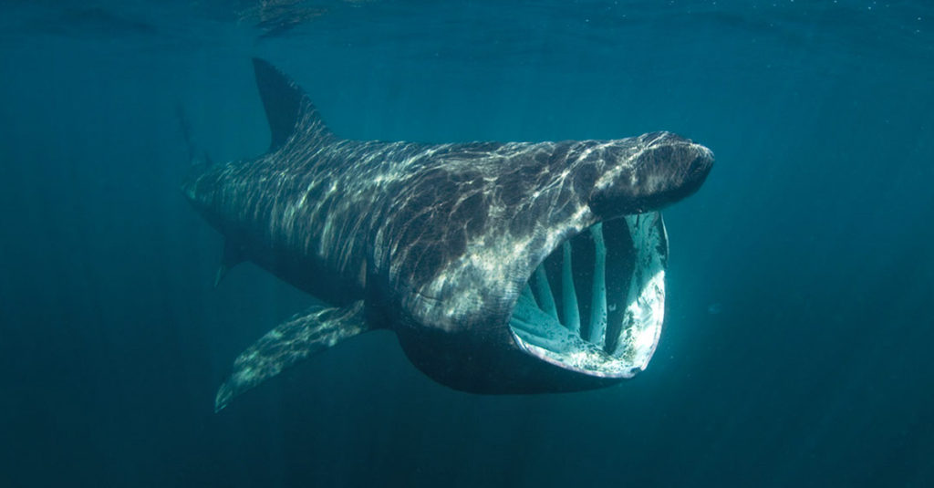 The basking shark is the second-largest living shark, after the whale shark, and one of three plankton-eating shark species, along with the whale shark and megamouth shark. Adults typically reach 7.9 m in length. It is usually greyish-brown, with mottled skin. (Text source: Wikipedia https://en.wikipedia.org/wiki/Basking_shark)