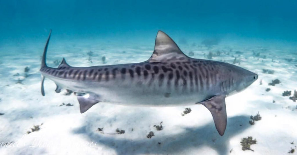 The tiger shark is a species of requiem shark and the only extant member of the genus Galeocerdo. It is a large macropredator, capable of attaining a length over 5 m. Populations are found in many tropical and temperate waters, especially around central Pacific islands. (Text source: Wikipedia https://en.wikipedia.org/wiki/Tiger_shark)