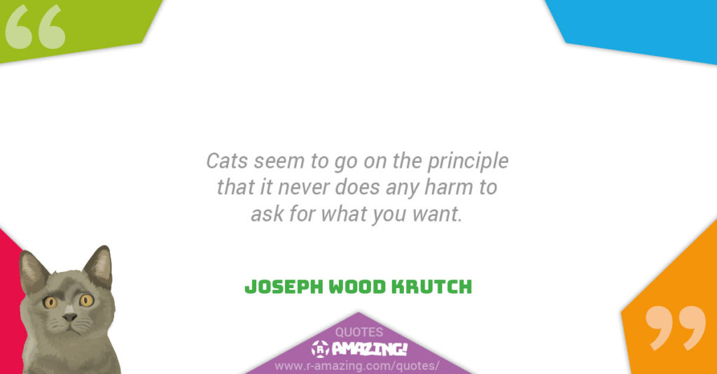Cat Quote – Ask (12/38) List item Submitted to "Quotes About Cats" Approved by Admin 6th October 2020, 12:11 pm 21 Views 0 Comments “Cats seem to go on the principle that it never does any harm to ask for what you want.” Joseph Wood Krutch Item navigation Previous submission Next submission View full list 0share Facebook Twitter Pinterest LinkedIn Comments Our site Facebook Leave a ReplyCancel replyYou must be logged in to post a comment. Reply with GIF GIPHY App Key not set. Please check settings Loading… 0 See more Previous article Cat Quote – Now (12/38) Next article Cat Quote – Gods (12/38) Written by Admin