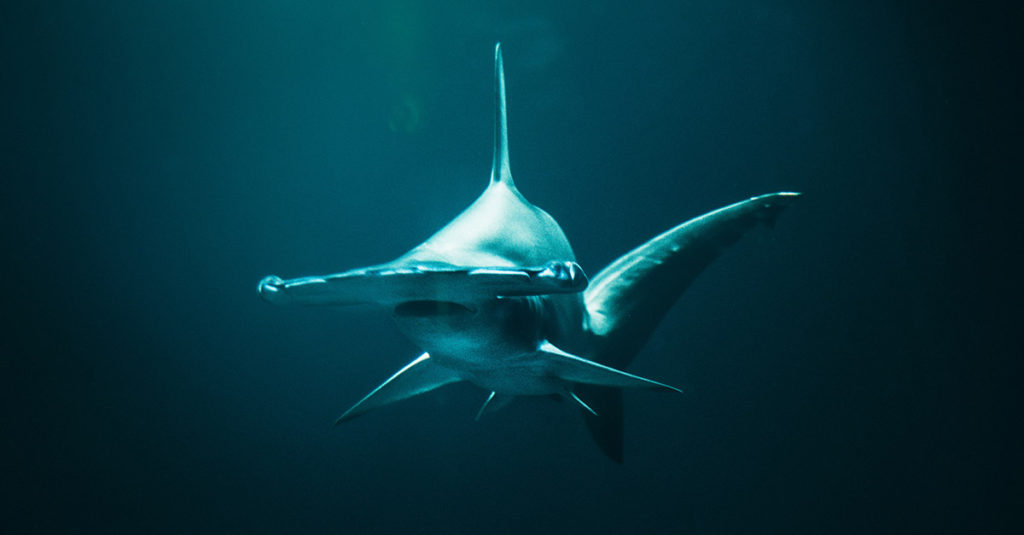 The hammerhead sharks are a group of sharks that form the family Sphyrnidae, so named for the unusual and distinctive structure of their heads, which are flattened and laterally extended into a “hammer” shape called a cephalofoil. (Text source: Wikipedia https://en.wikipedia.org/wiki/Hammerhead_shark)